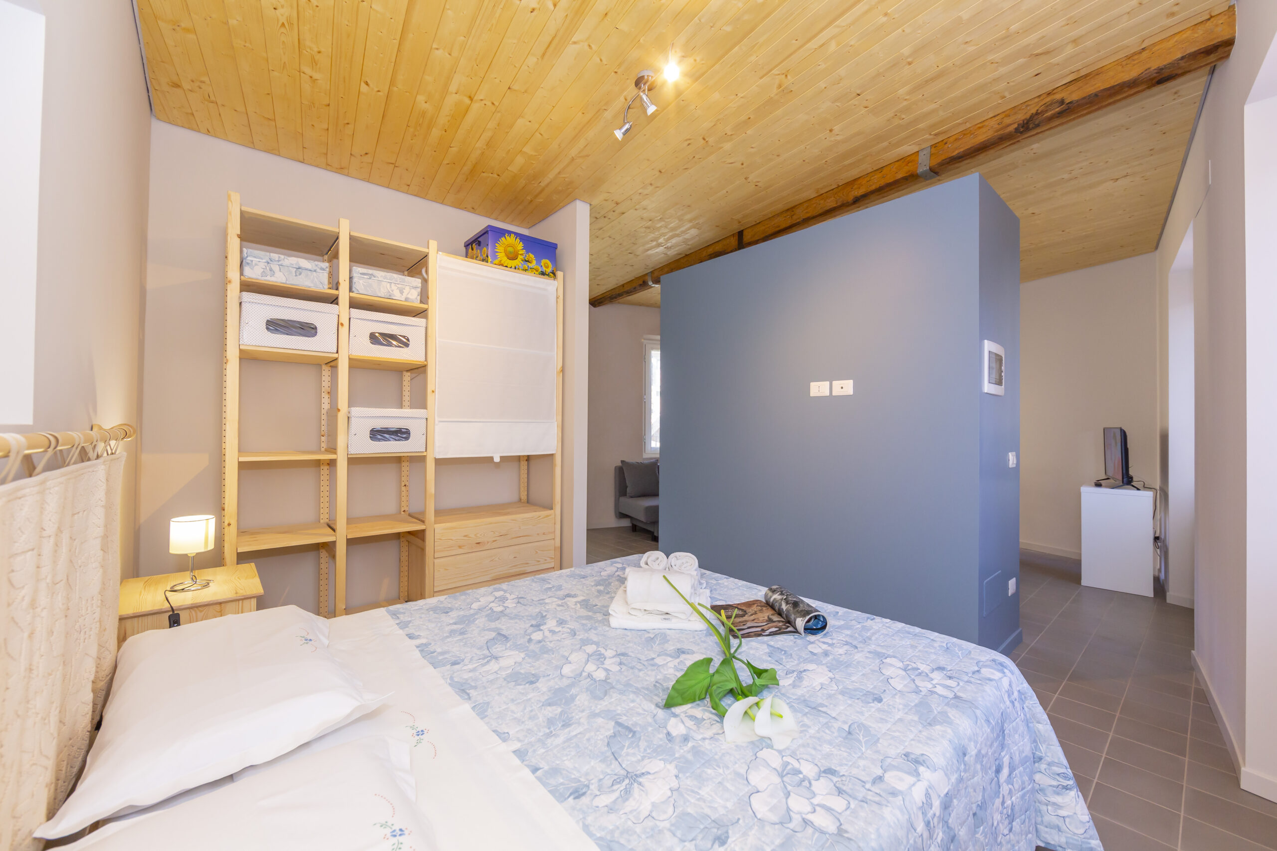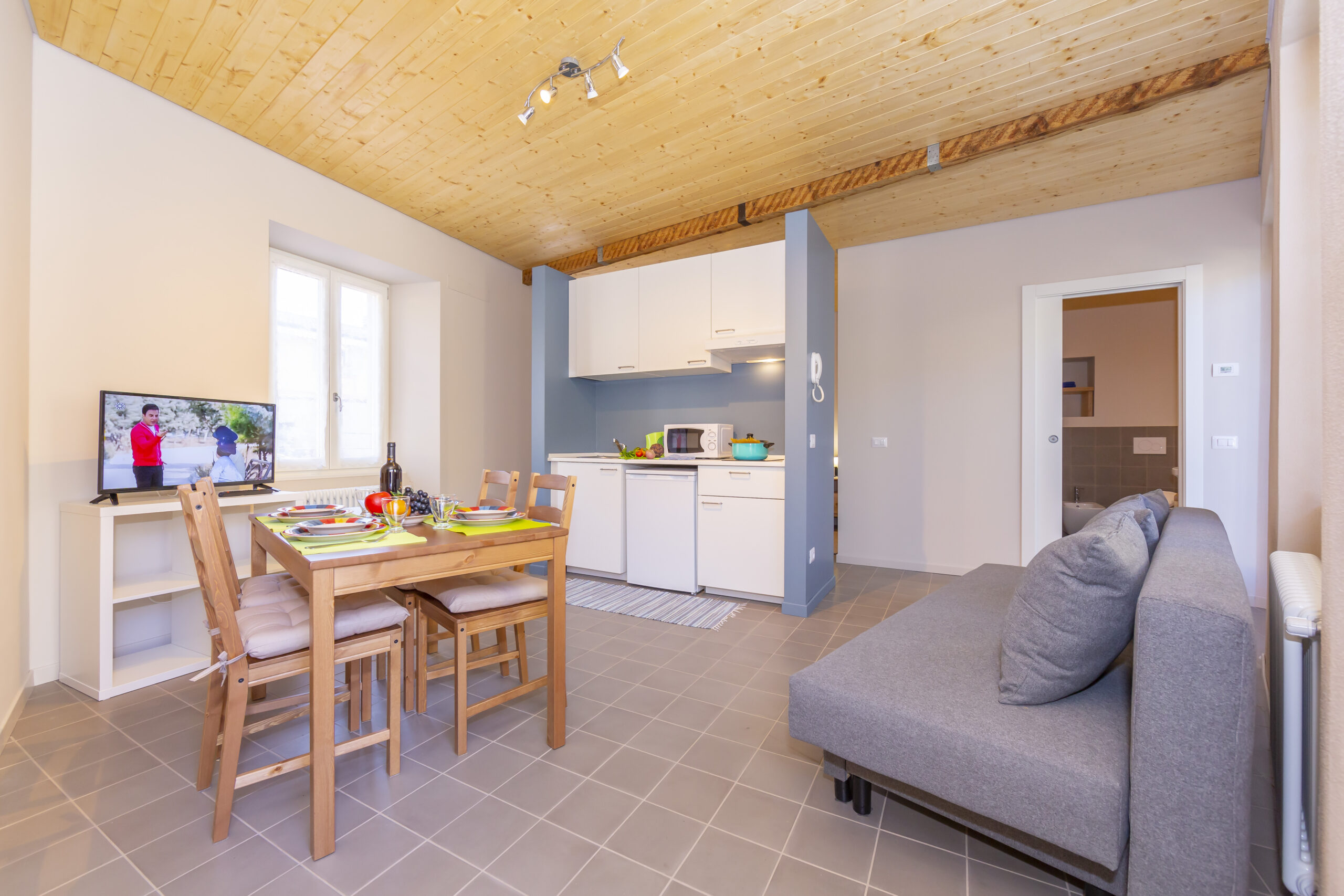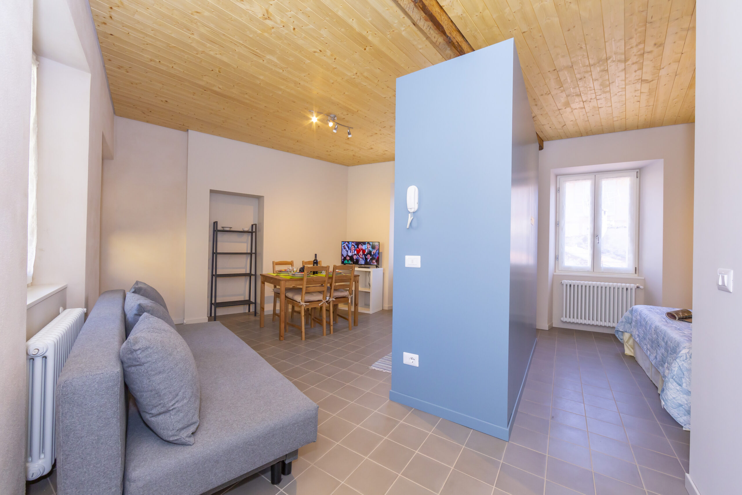 ingresso, soggiorno con cucina a vista, che separa la zona notte arredata con letto matrimoniale e bagno con doccia.